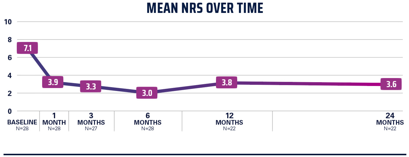 NRS: 64% of participants achieved a substantial clinical benefit (SCB) with >50% improvement in back pain at 24 months (p<0.001).