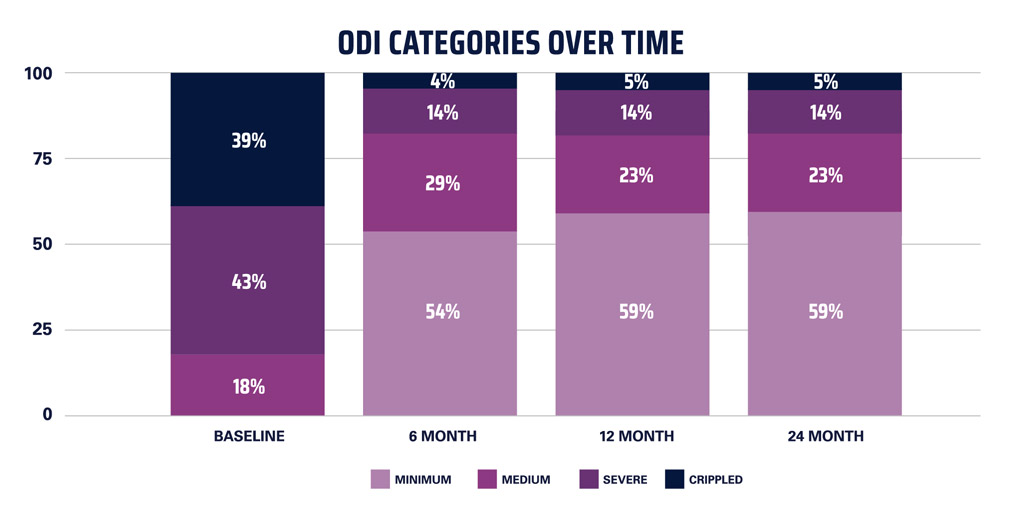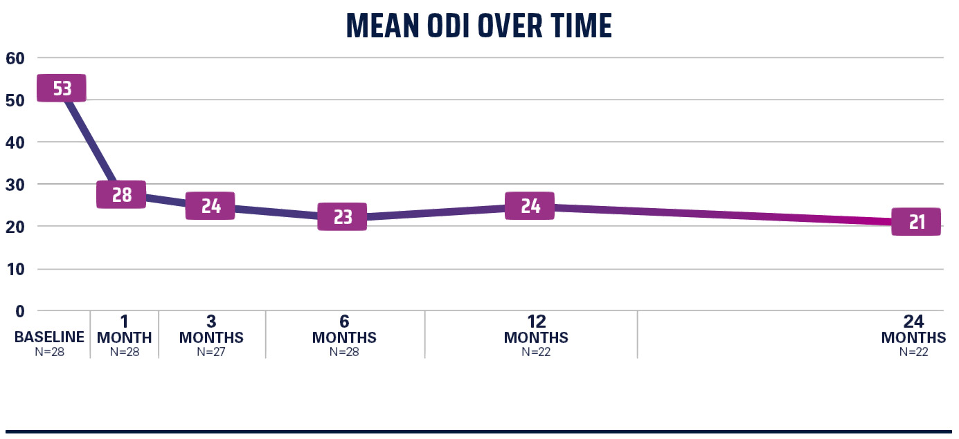 ODI: 73% of participants achieved a minimal clinically important difference (MCID) of > 30% improvement in ODI from baseline to 24 months (p<0.001).