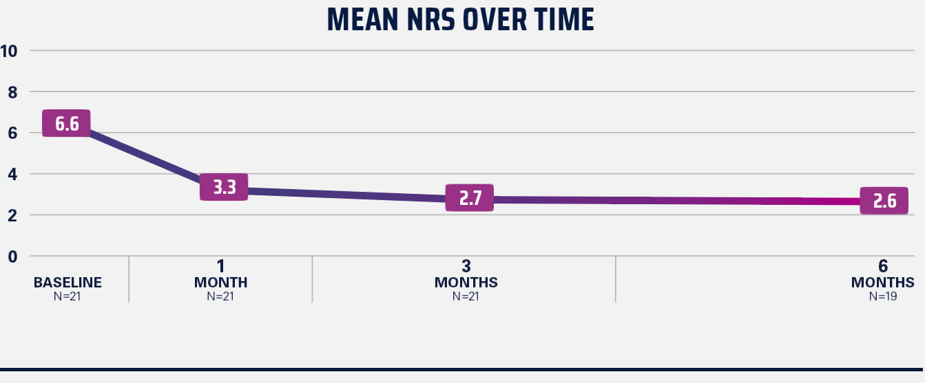 NRS: Statistically significant 60% reduction in back pain between baseline and 6 months, with 82% of participants achieving MCID of > 30% reduction in pain (p<0.001).