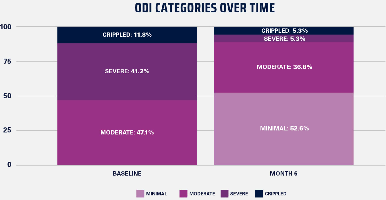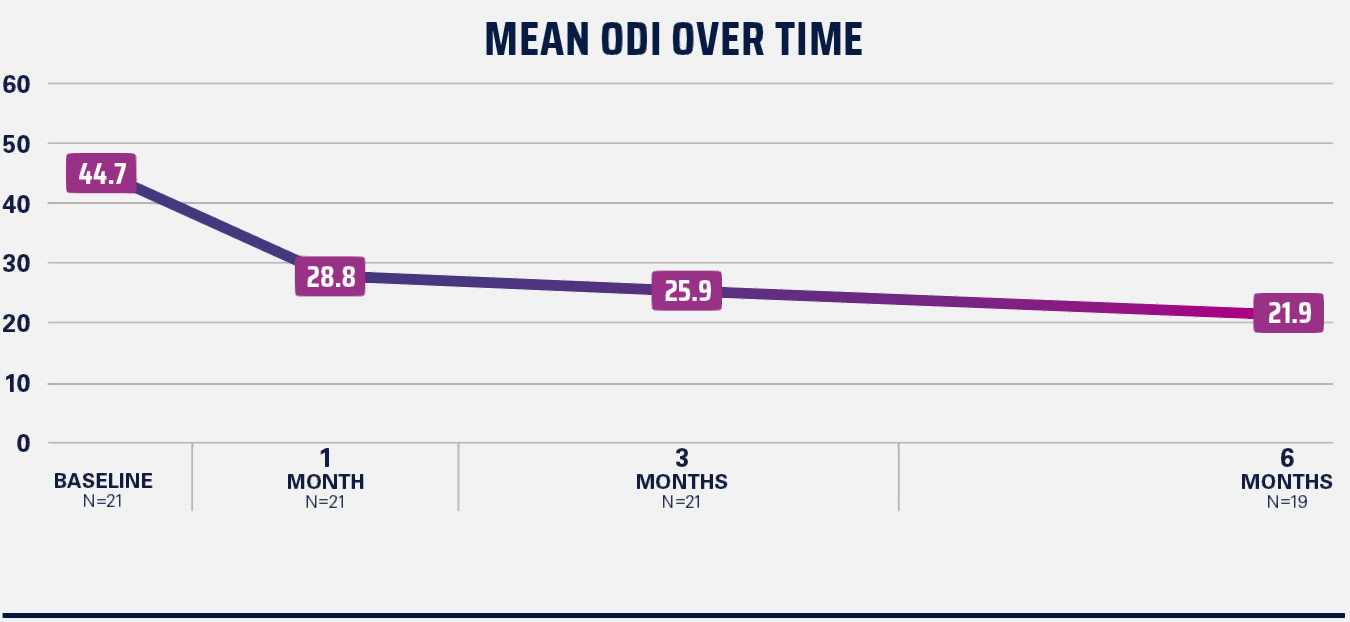 ODI: 6-month improvement in mean ODI scores was 50%, with 68% of participants achieving MCID